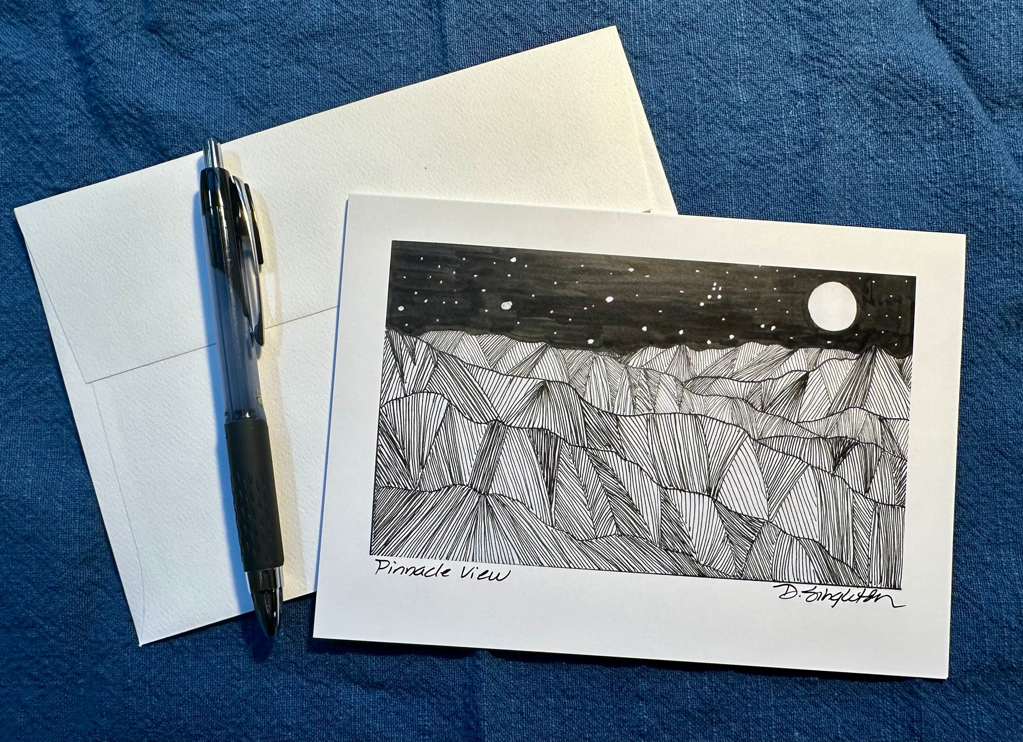 One of my most popular prints, Pinnacle View at Night, is now a 5x7 greeting card with an envelope. The original piece was created with pen and ink in my sketchbook, based off of a photo I shot from the Pinnacle in Sylva, NC looking east.