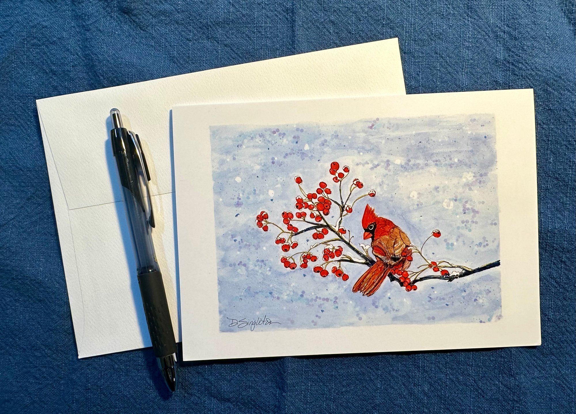 This 5x7 greeting card depicts one of my winter themed paintings. A female cardinal on a branch of red berries. The original was created with watercolor, pen, and gouache.