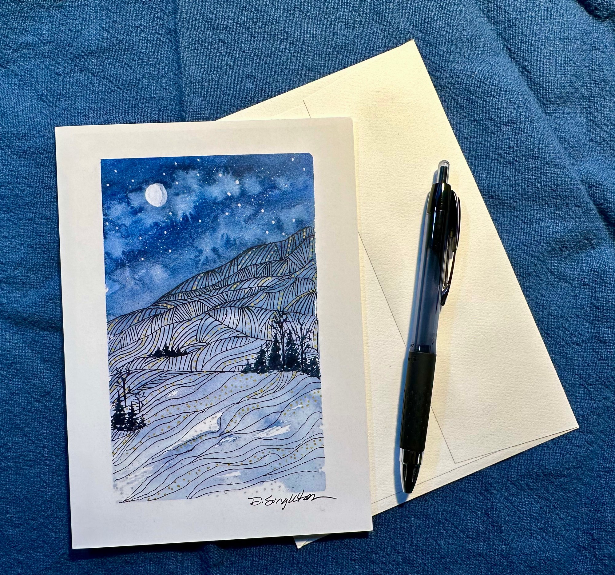 Each year I create a special painting on the winter solstice. This greeting card features the Winter Solstice of 2024 with the moon phase of that date. Original painting was created with watercolor, pen, and gel pen. This card measures 5" x 7" and comes with an envelope.